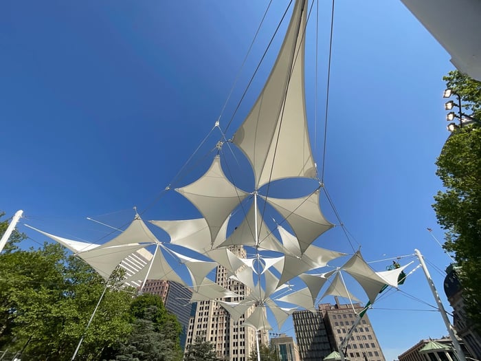 City Center Array was commissioned by City of Providence’s Department of Parks for a budget of over $1.4 million. GuildWorks designed and installed this prize-winning, complex tensile shade structure over the Providence City Center Ice Rink. The "City Center Array" features a 3D cable network and suspended struts, designed for stability during snowy winters while providing aesthetic, efficient overhead coverage.