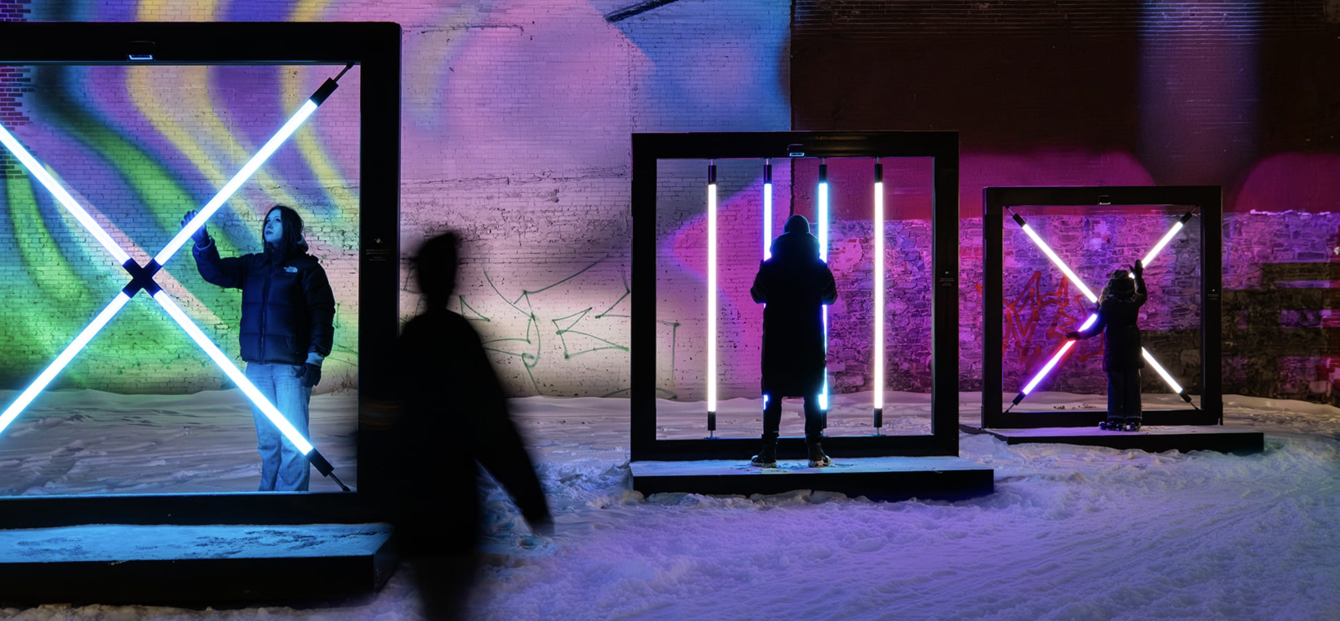 The project premiered at LUMINO, in Montréal’s Quartier des spectacles near the Saint-Laurent metro, a sector marked by both cultural vitality and visible social challenges. Installed in an area often perceived as transitional, Parallels contributed to revitalizing the site through presence and light. Its luminous architecture increased visibility and brought a sense of warmth and safety after dark. More importantly, it encouraged people to stay. Families, groups of friends, and passersby gathered, interacted, and shared the same space longer than they might otherwise have.
